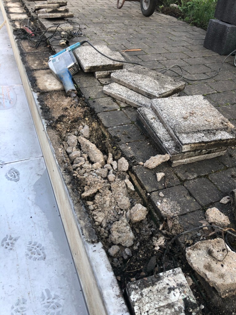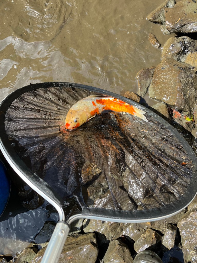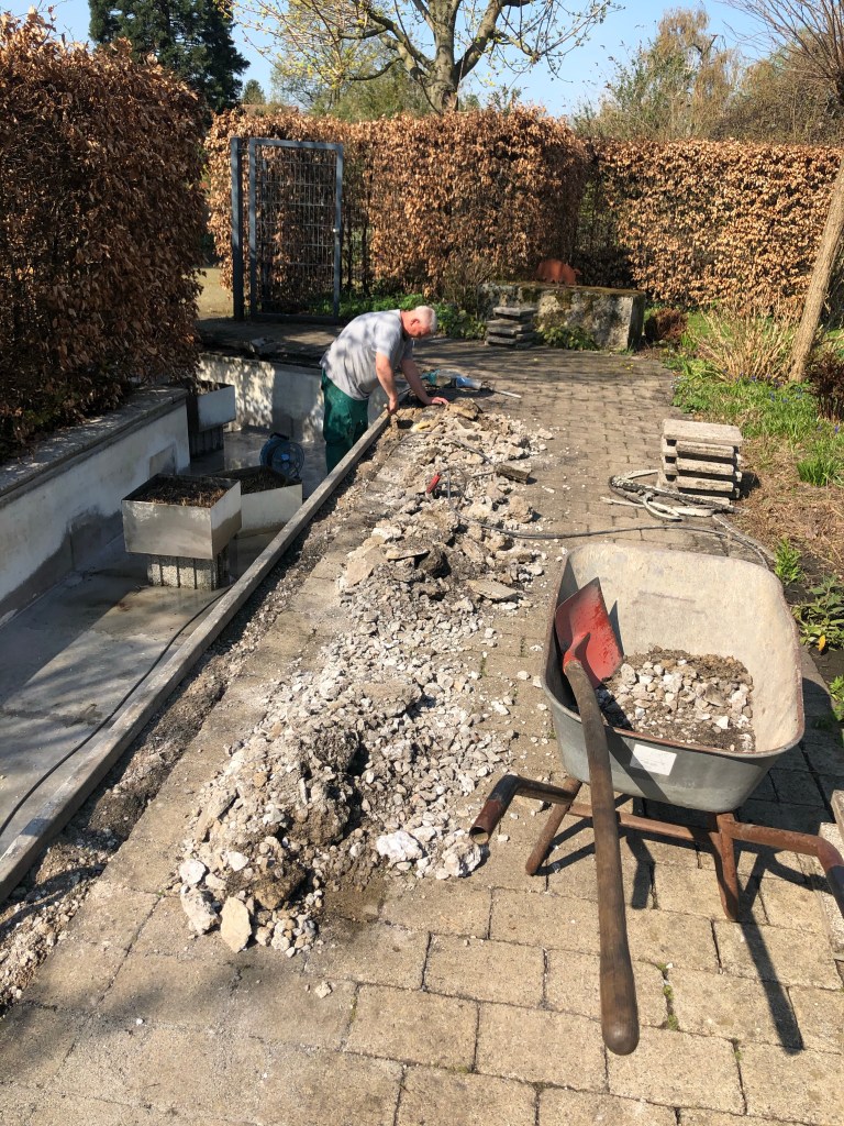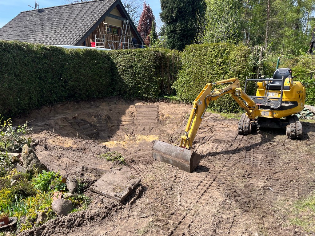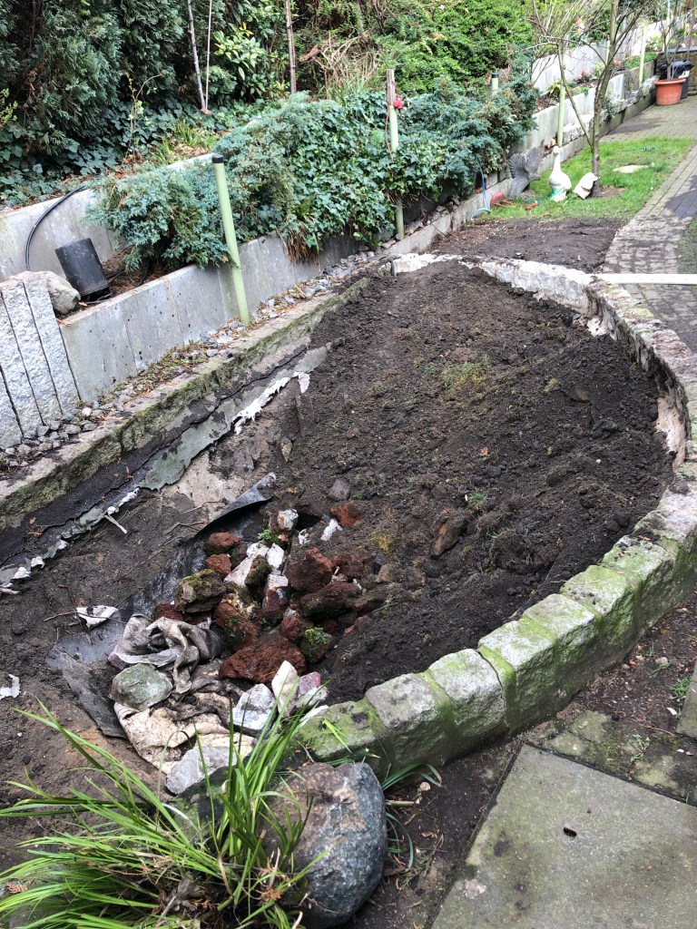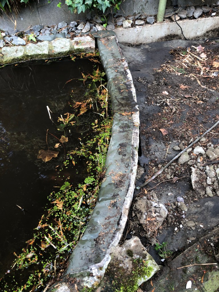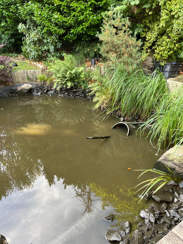 Der Kunde bekam von uns an einer anderen Stelle des Grundstücks einen neuen Koiteich errichtet. Dieser gänzlich unprofessionell angelegte Teich glich eher einem Sumpfloch, die vorhandenen Koi konnte man in der braunen Brühe nicht erkennen.